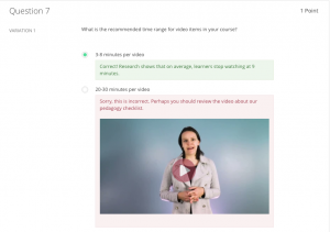 - Provide learners with actionable feedback: research shows that immediate and actionable feedback on assessments can support better learning outcomes. Feedback supports all learner’s success, but females can benefit even more, thus reducing gender gaps. As mentioned above, females are more likely than males to succeed after reviewing relevant content when struggling. There are several ways to offer effective feedback on Coursera. One is embedding a short video in each of the answer options in a quiz. Using videos in online quiz feedback shows a significant positive impact on learners’ progression rates.