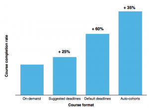Almost immediately, we saw more learners enrolling in courses. Unshackled from course schedules, some of them were able to binge through an entire course in a weekend. Amazing! However, the vast majority of learners who didn’t finish their courses immediately were coming back to keep working less often, and many weren’t coming back at all. We spoke to these learners to understand this pattern better:
