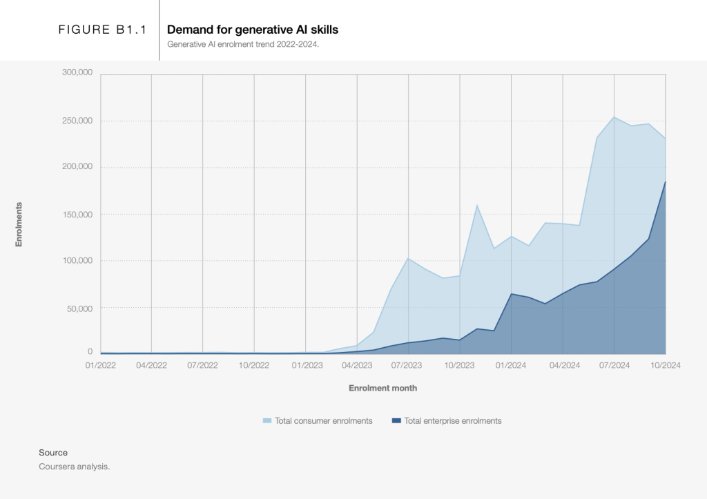 Online learning will play a vital role in addressing the widespread skills gap, driving workforce transformation, and supporting job transitions. Coursera data for the Future of Jobs Report 2025 reveals significant growth in demand for Generative AI training among both individual and enterprise learners: